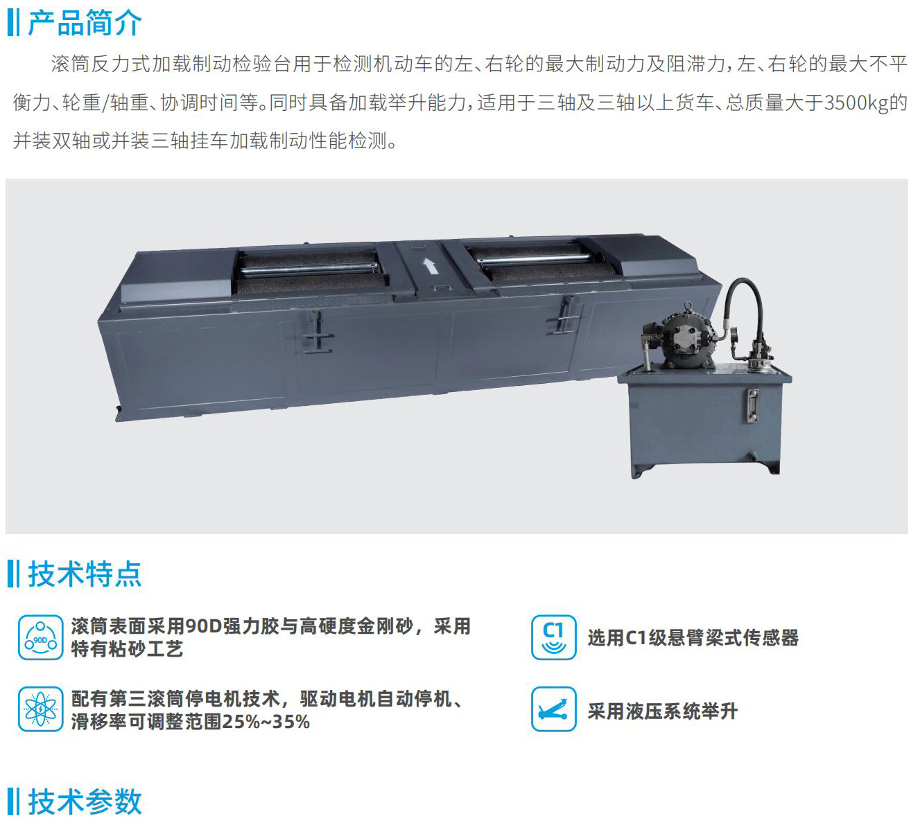 滾筒反力式加載制動(dòng)檢驗(yàn)臺(tái)用于檢測(cè)機(jī)動(dòng)車的左、右輪的最大制動(dòng)力及阻滯力,左、右輪的最大不平衡力、輪重/軸重、協(xié)調(diào)時(shí)間等。同時(shí)具備加載舉升能力,適用于三軸及三軸以上貨車、總質(zhì)量大于3500kg的并裝雙軸或并裝三軸掛車加載制動(dòng)性能檢測(cè)。
